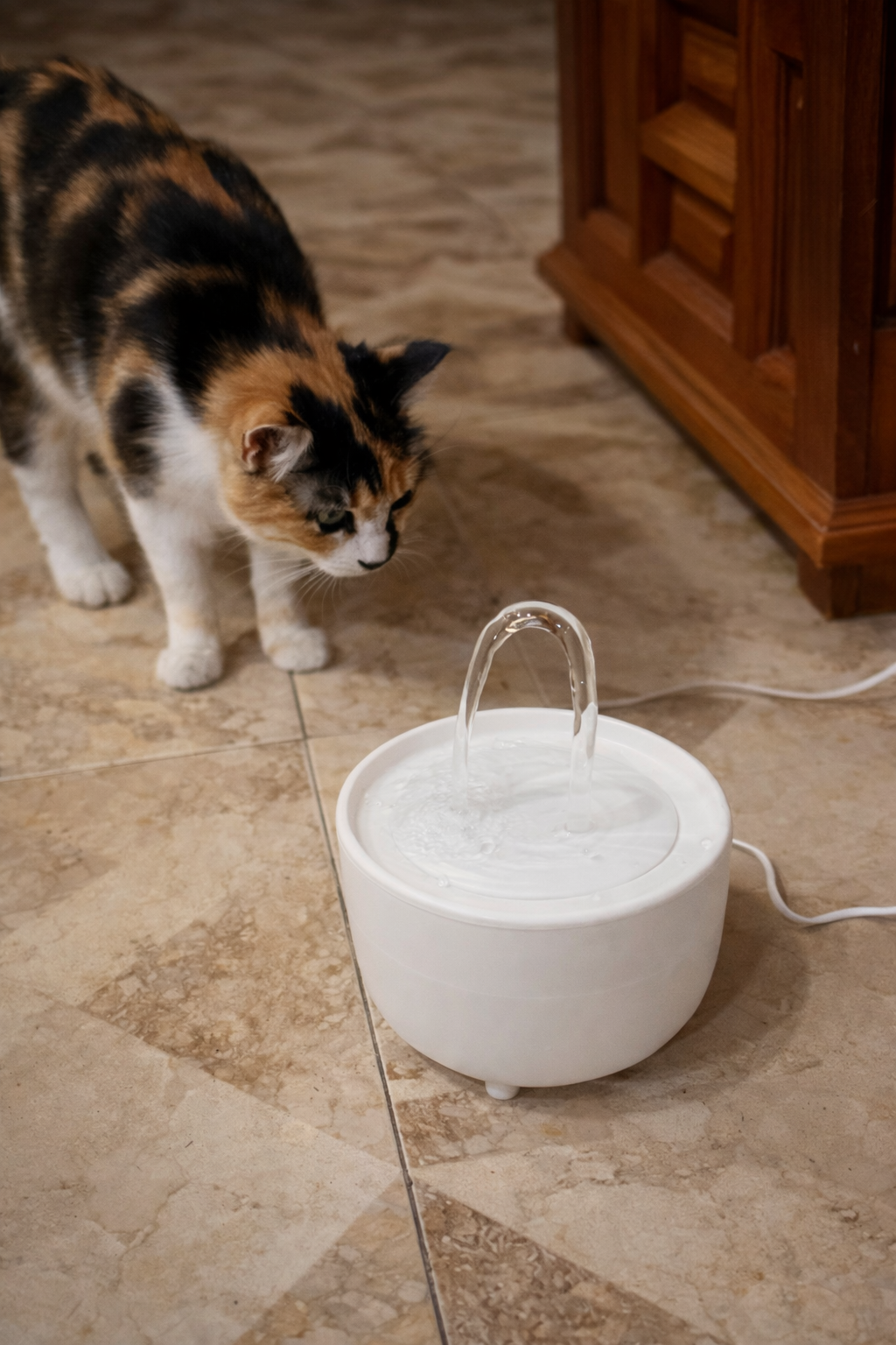 Zapewnij kotu stały dostęp do świeżej, czystej wody. Fontanna delikatnie filtruje i porusza wodę, co naturalnie zachęca kota do częstszego picia.